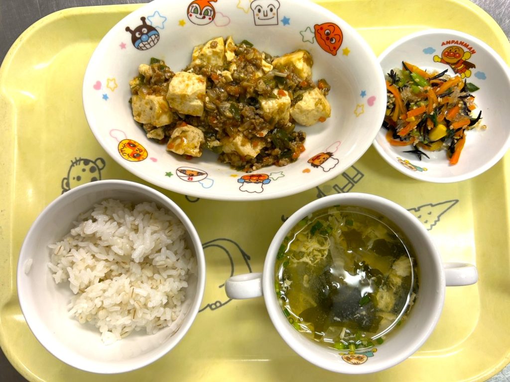 今日は「麻婆豆腐だよー!!」というと「やった!」「イエーイ!」と