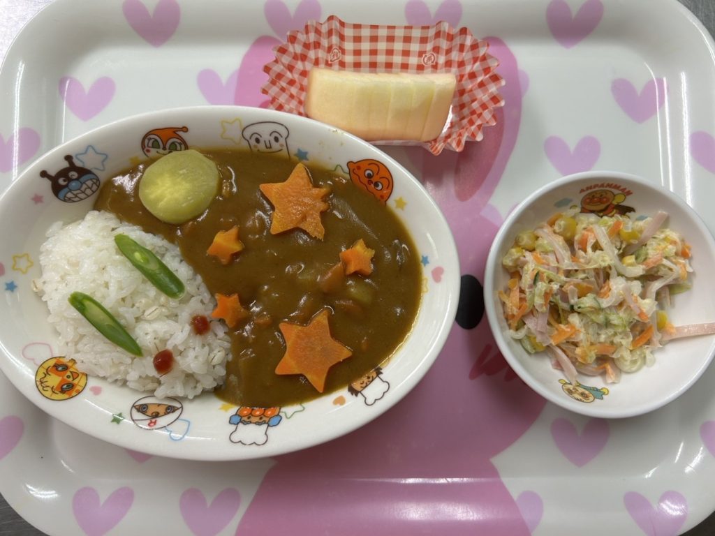 今日の給食 ツイート 〈メニュー〉麦ごはんお月見カレーコールスローサラダ果物今日は十五夜ですね。かがやきでは、お月見メニューを提供しました。さつまいもを月に見立てて、ご飯をうさぎにしましたよ。園児のみなさん大喜びでした。7日が満月ですが、昔から十五夜は秋の夜空に最も美しく月が見える日とされているので、ぜひ今日は夜空を見上げてほしいと思います。