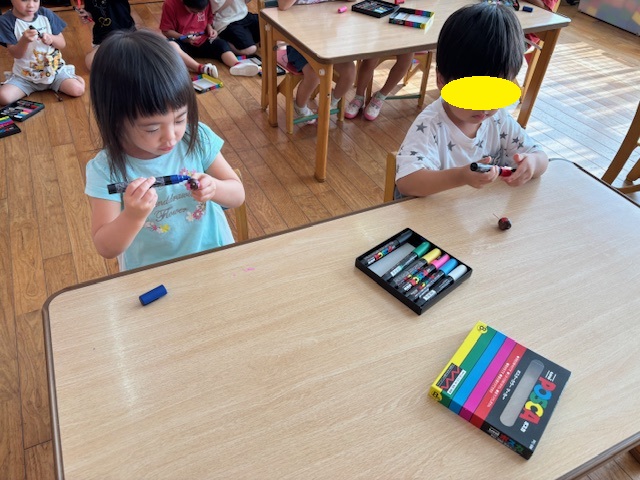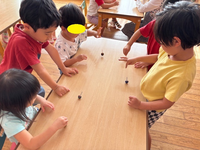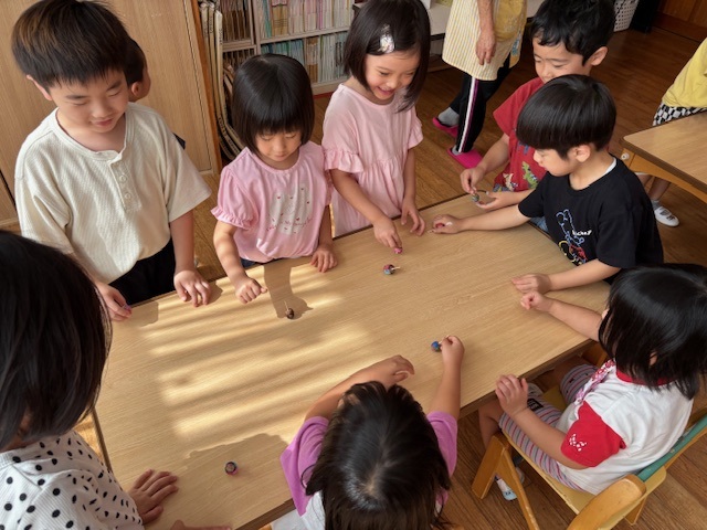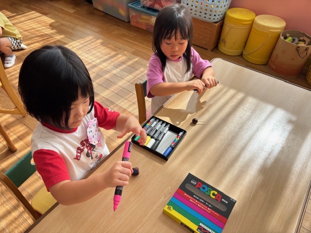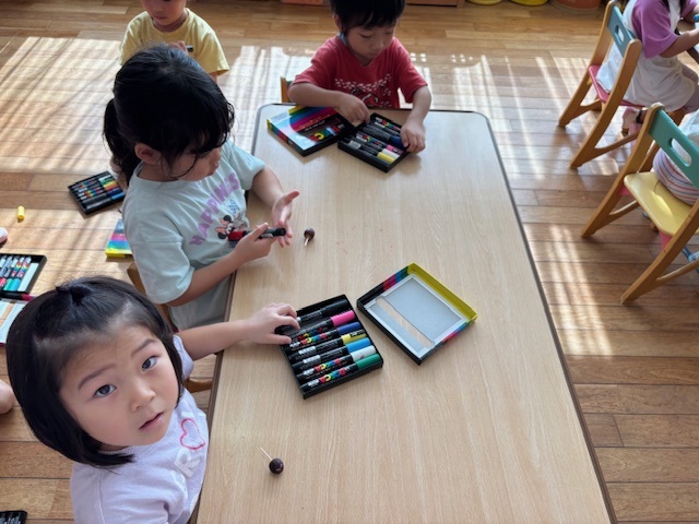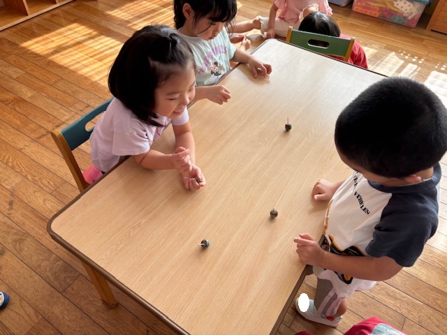 今日は、年長のお友だちが持ってきてくれたどんぐりを使って、コマ作りをしました。それぞれきれいに色を塗りましたよ。完成した後は、お友だちと一緒に回したり、誰が一番長く回るかを競争したりしました!