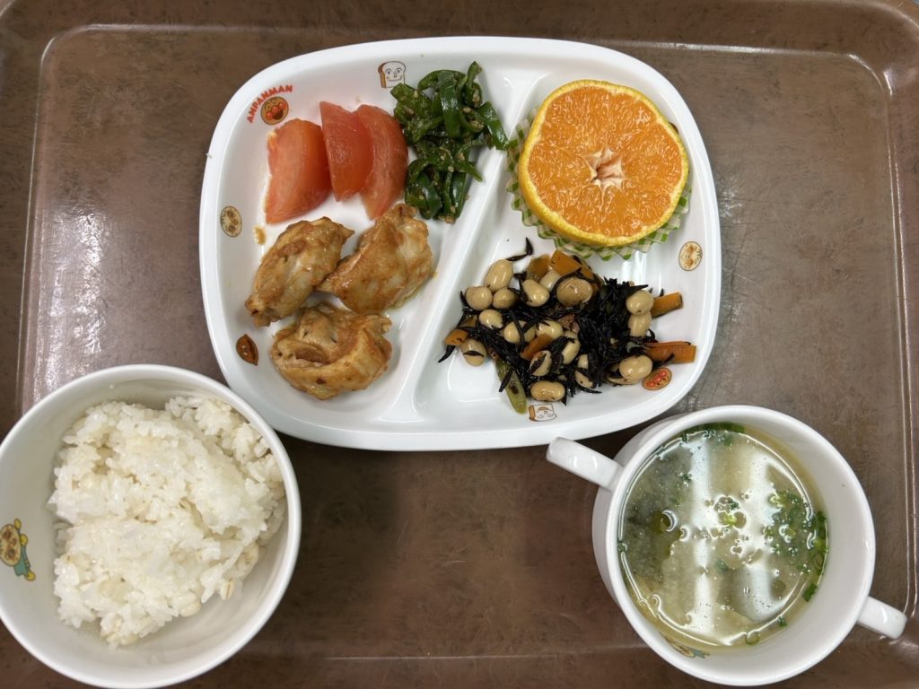 今日の給食 ツイート 〈メニュー〉麦ごはんタンドリーチキンピーマンのごま和えひじきの煮物大根のみそ汁果物今日は朝から採れたピーマンをごま和えに、なすをみそ汁の中に入れて提供しました。ピーマンが苦手な園児もかがやきで採れたものだときくと興味を持って食べていましたよ。