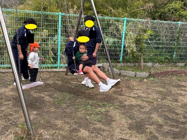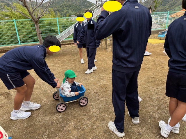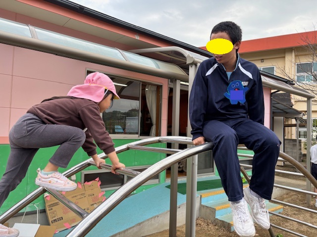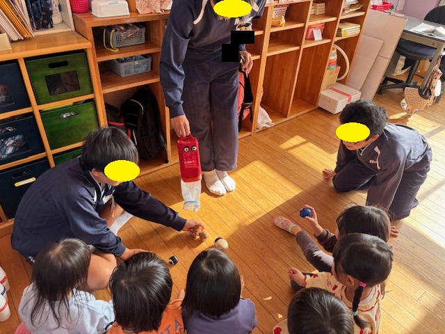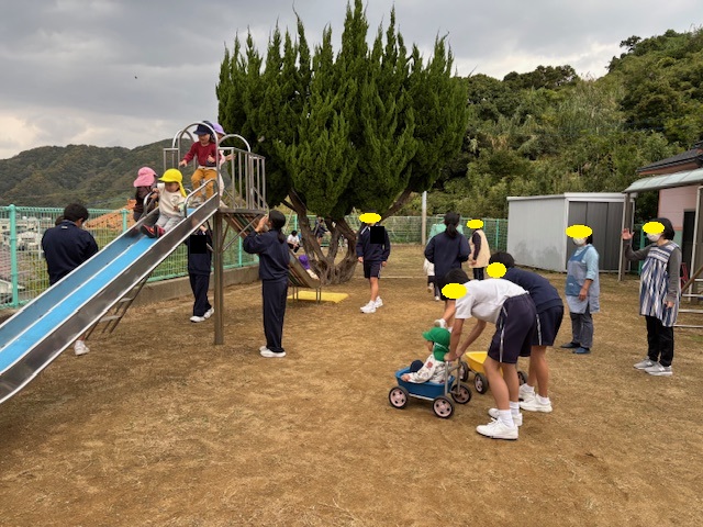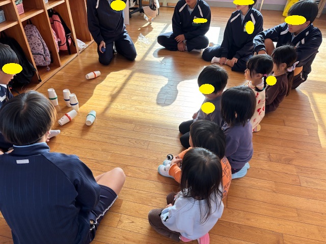 青潮学園の9年生が遊びに来てくれました! ツイート 今日は、青潮学園の9年生のお兄さん、お姉さんが遊びに来てくれました。お兄さん、お姉さんの手作りのおもちゃで遊んだり、園庭で一緒に遊んだり...とても楽しい時間を過ごしました。最後はお兄さん、お姉さんの素敵な歌声も聴かせてもらいましたよ!また遊びに来て下さいね!