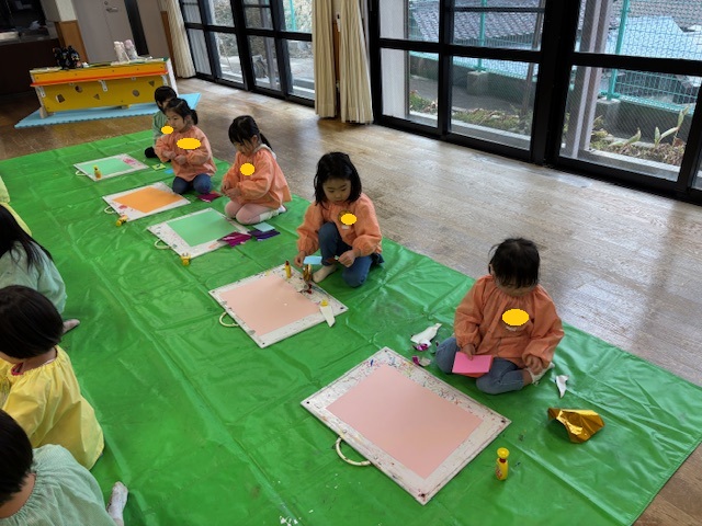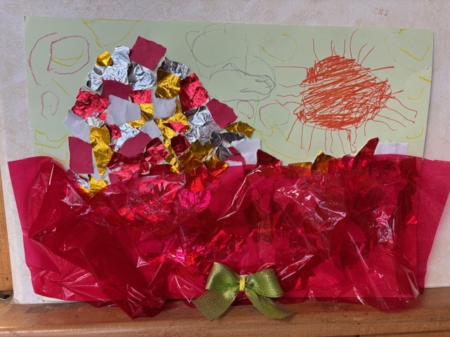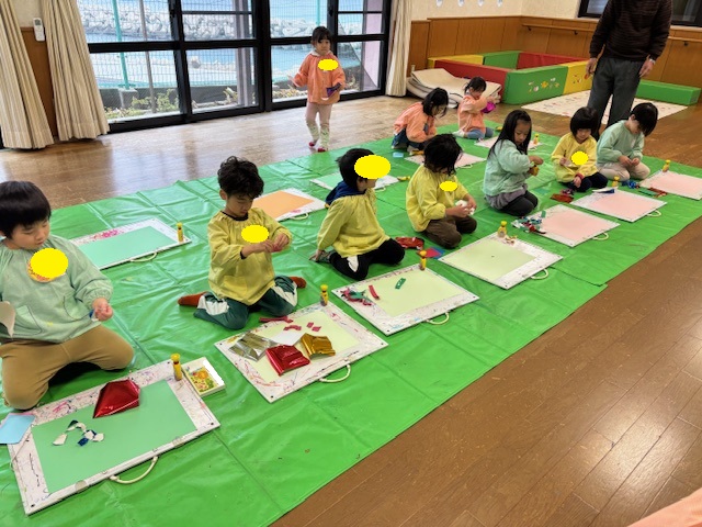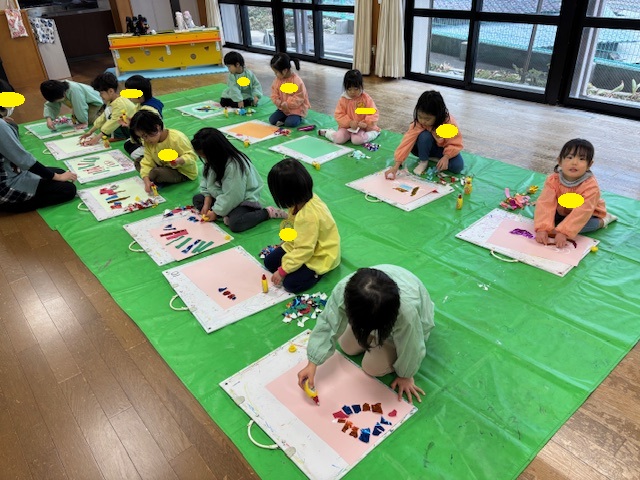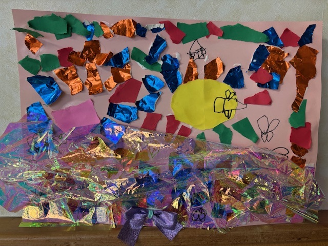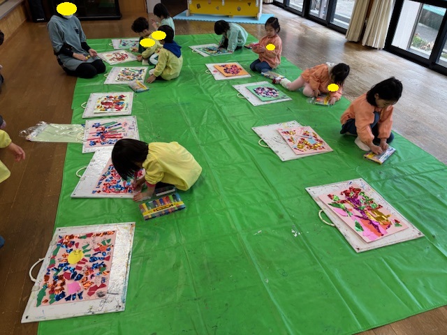 今日の絵画教室は、画用紙にちぎった紙を貼り付け、ラッピングフィルムやリボンで飾り付けをして、花束を作りました。