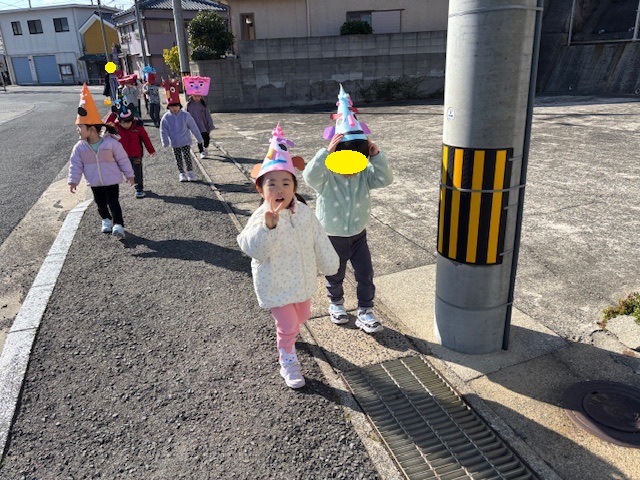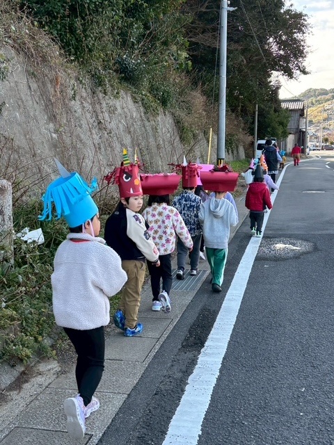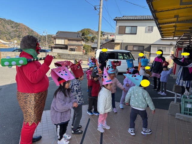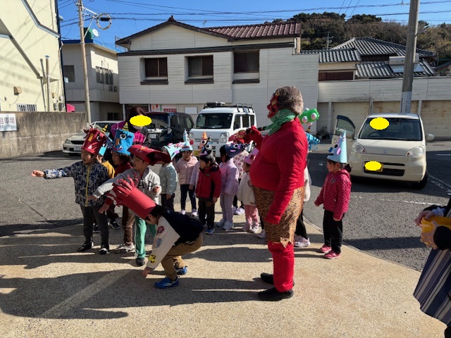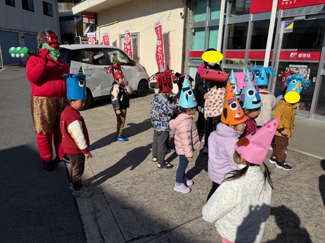 にじ組、ほし組のお友だちは、園内での豆まきが終わった後、十八親和銀行さん、郵便局さん、まるよしストアさんへ行き、豆まきをしてきました。お天気もよく、いいお散歩にもなりました。