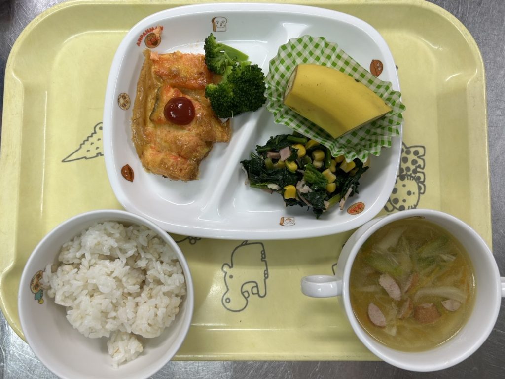 今日の給食 ツイート 〈メニュー〉麦ごはん鮭のカレーピカタほうれん草のソテーアスパラ入りコンソメスープ果物今日は、今が旬のアスパラガスが給食に登場しました。鮭のカレーピカタも身がふんわりとしていて美味しかったですよ。