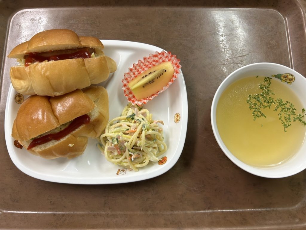 今日の給食 ツイート 〈メニュー〉ホットドッグスパゲティーサラダコンソメスープ果物年中さんは進級して初めてホットドッグが2つ提供されたので「食べきれるかな」と心配しましたが、「任せて~!!」とパクパク!お代わりした園児もいましたよ。スパゲティーサラダも美味しかったようで良かったです。