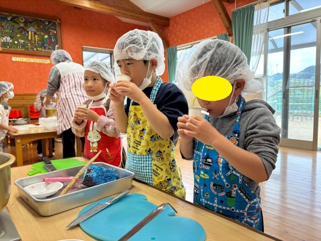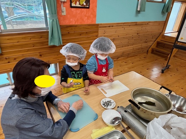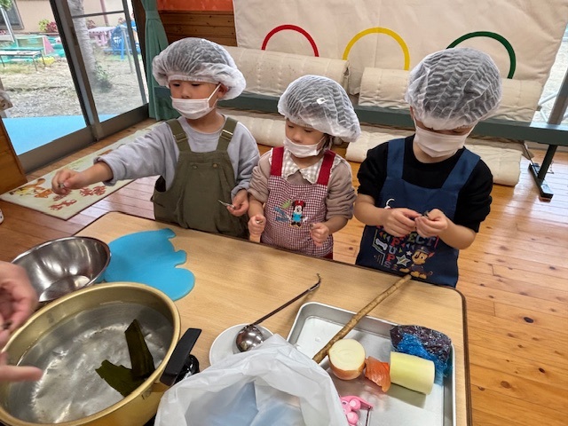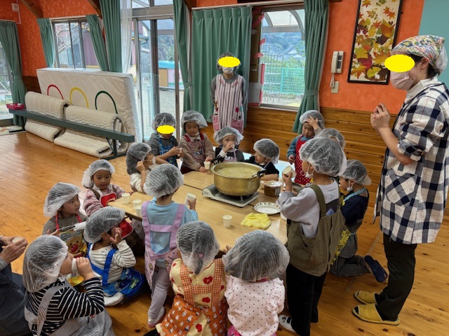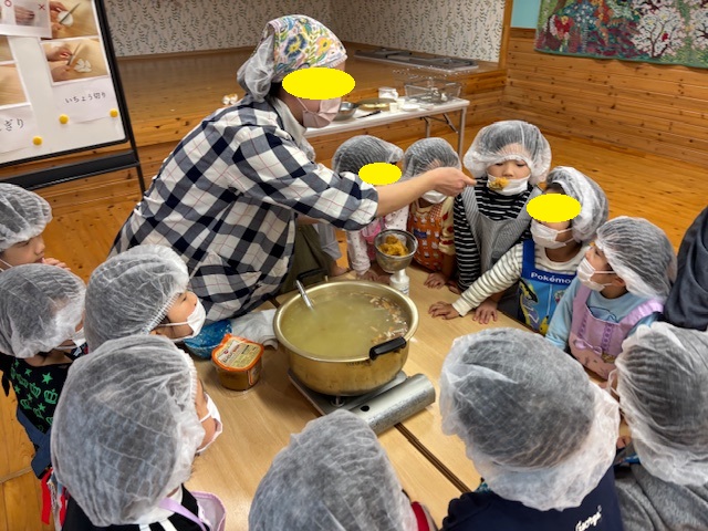 豚汁クッキング 今日は、栄養士の先生のご指導のもと、みんなで豚汁を作りました。煮干しの頭を取ったり、出汁を味見したり、お野菜を切ったり...とってもおいしい豚汁ができあがり、みんなでいただきました。「おいしーい!」や「大根やわらかくなってる!」など、たくさんの感想が聞こえましたよ!