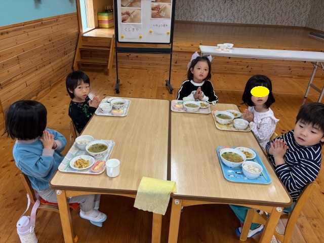 今日の給食 〈メニュー〉赤飯エビフライ(以上児)鯛フライ(未満児)フライドポテト添え野菜花麩の吸い物果物今日は七五三お祝い給食でした。赤飯が好評で「おかわりしたい!」と皆さん喜んでくれましたよ。おめでとうございます! にじ組さんのお友達も良い笑顔です‼