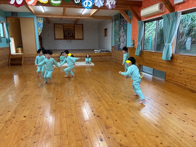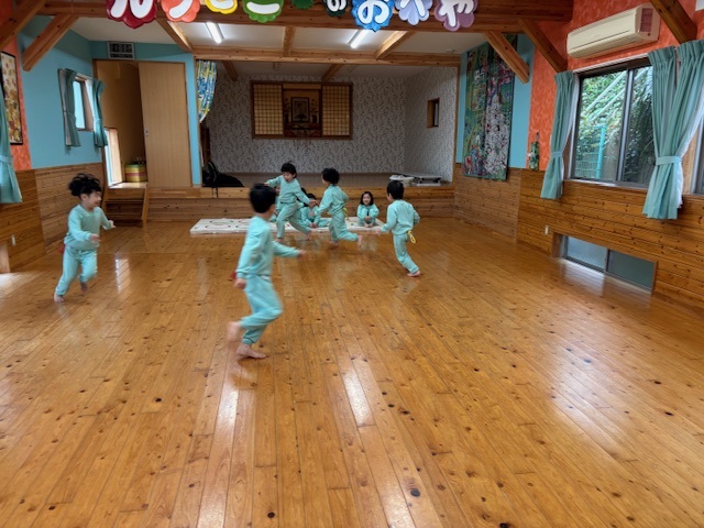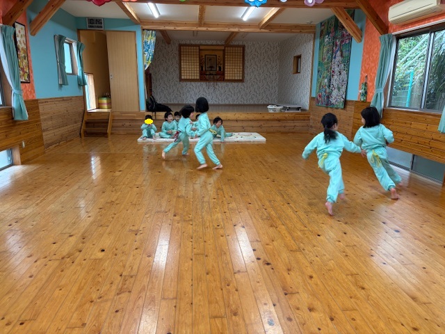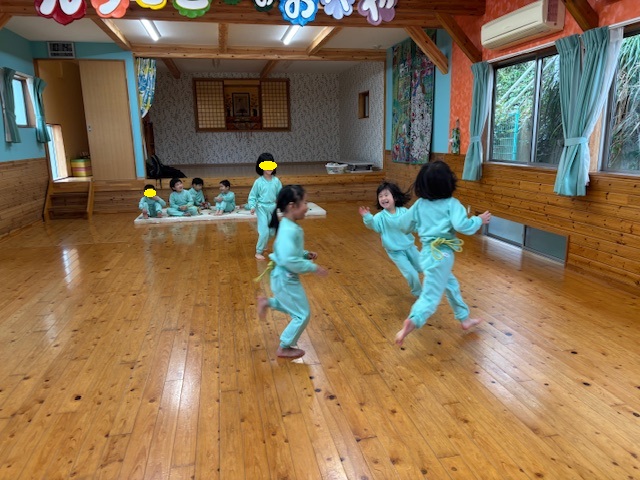 体操教室 にじ組 今日の体操教室で、縄跳びをしました。縄跳びの前に縄をしっぽにして、しっぽ取りをしました。しっぽを取られないように逃げるだけでなく、お尻を見せないように逃げたり、相手の動きを見ながら取ったりと上手に体を動かすようになってきました。縄跳びも跳ぶ回数が増えてきています。