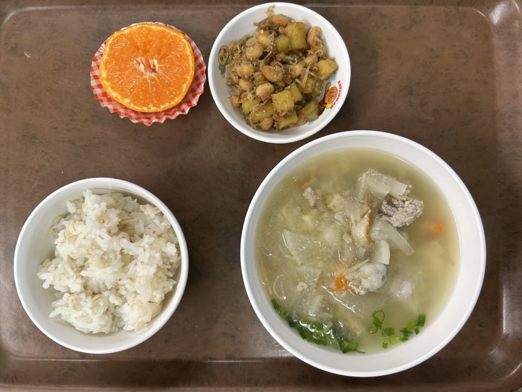今日の給食 〈メニュー〉麦ごはん豚汁高野豆腐の玉子とじ果物今日は、にじ組・ほし組と一緒に豚汁クッキングでした。24日が「和食の日」ということで、煮干しと昆布から出汁をとるところからしましたよ。みんなが頑張って切った野菜がたっぷり入った豚汁はとっても美味しかったです。また、クッキングしましょうね!